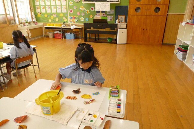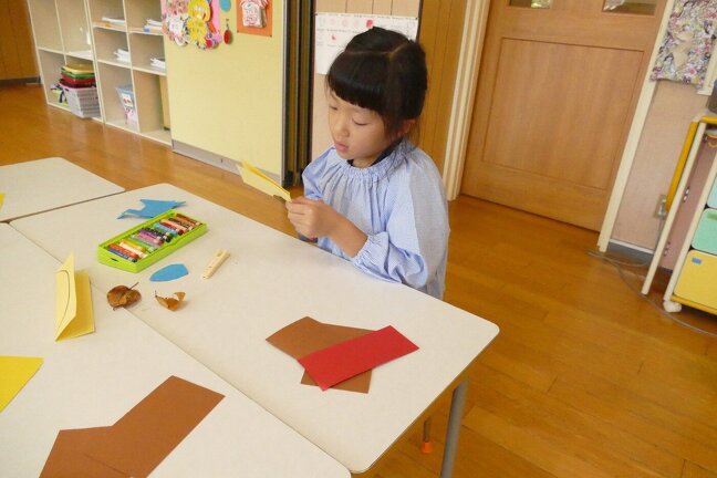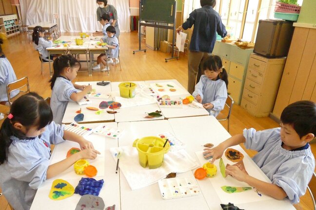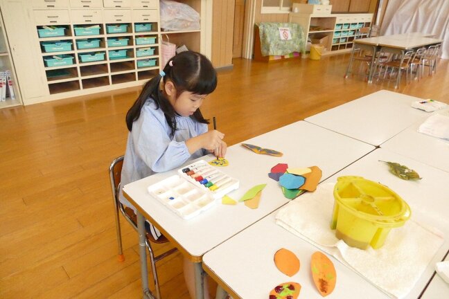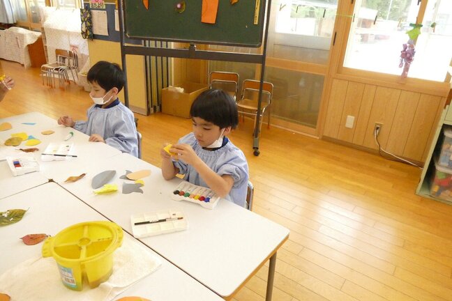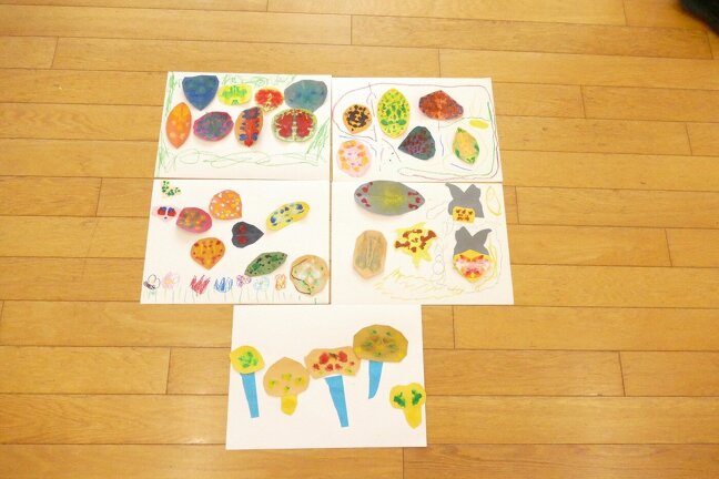 今回の絵画教室はデカルコマニーに挑戦。画用紙に好きな葉っぱの形を描いて切って絵の具を付けて畳んで広げるとー・・・