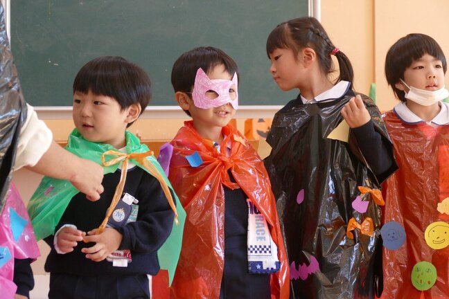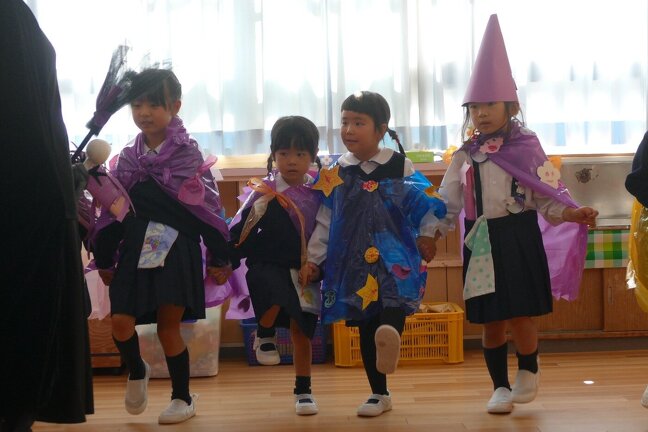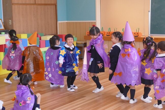 誕生会の後はハロウィンパーティーをしましや。みんな思い思いのハロウィンの衣装を作りみんなの前でお披露目しました。