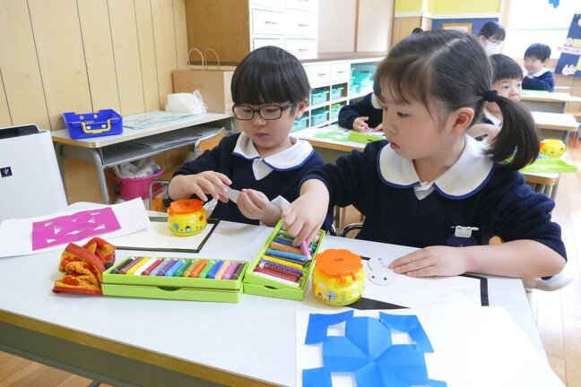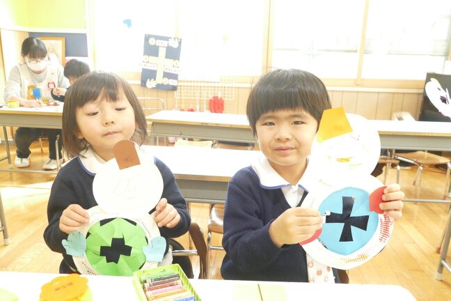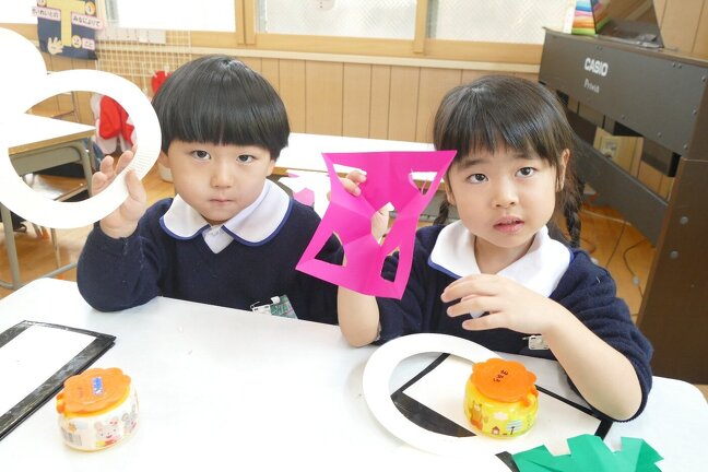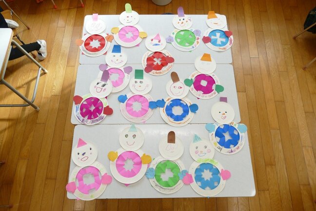 年少組の絵画教室です。紙皿を使って雪だるまを作りました。お腹の部分は切り紙をしました。 かわいい雪だるまが出来ました。