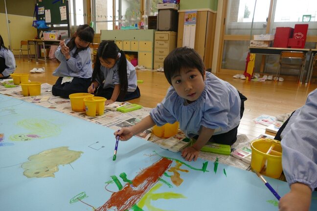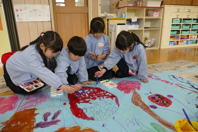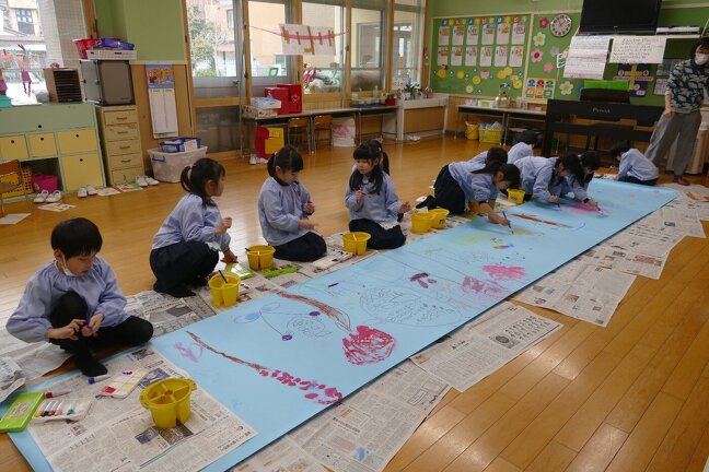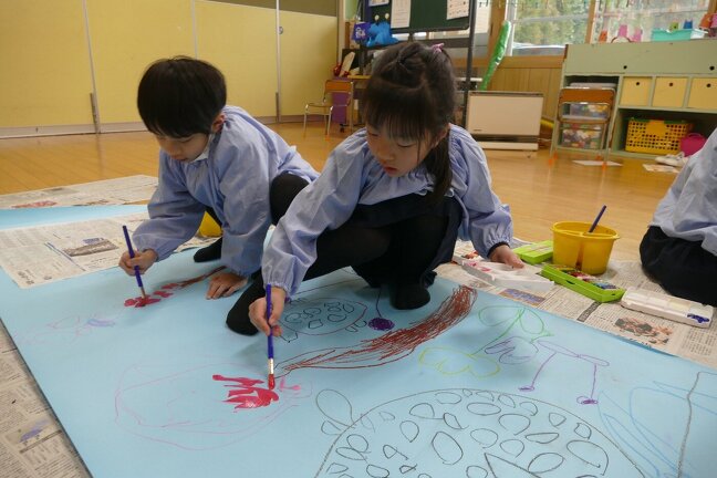 年長最後の絵画教室です。大作に挑戦しました。下絵を描いてみて、大きな紙にみんなでえがきました。