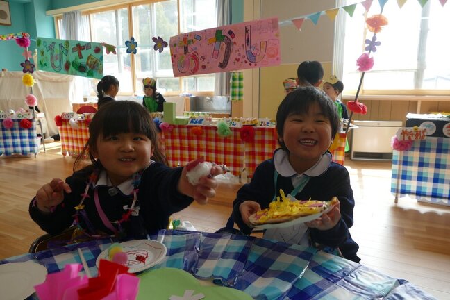 待ちに待ったお店屋さんがオープンしました。名前は「わくわくしょっぴんぎもーる」です。八百屋さんやクレープ屋さん、けーきやさんにアイスクリーム屋さん、焼きそば、ホットドッグ、ピザ、たこ焼き、ラーメンオムライスランチ、エビフライランチ、おもちゃ屋さんにアクセサリー屋さん、みんなお店屋さんになったりお客さんになったりと、笑顔があふれっぱなしでした。