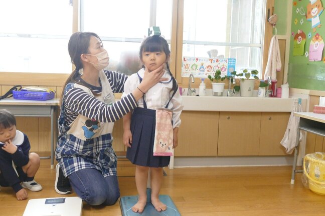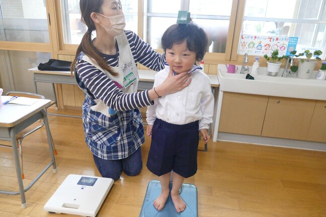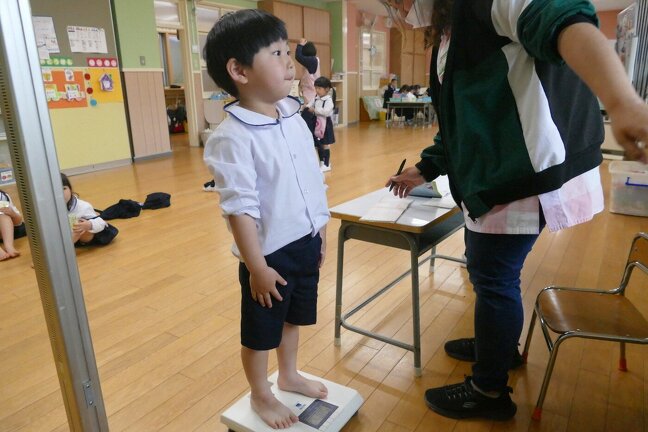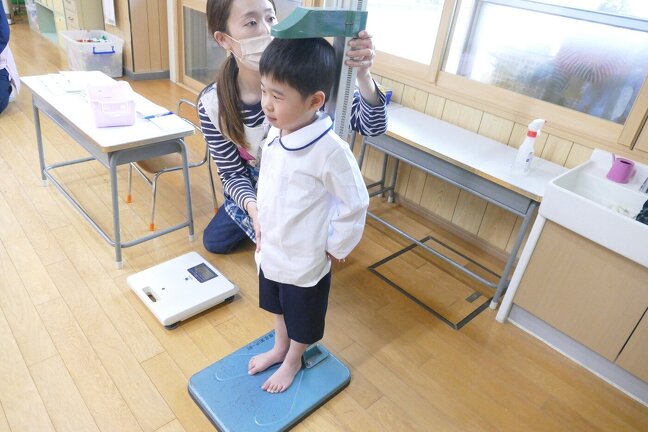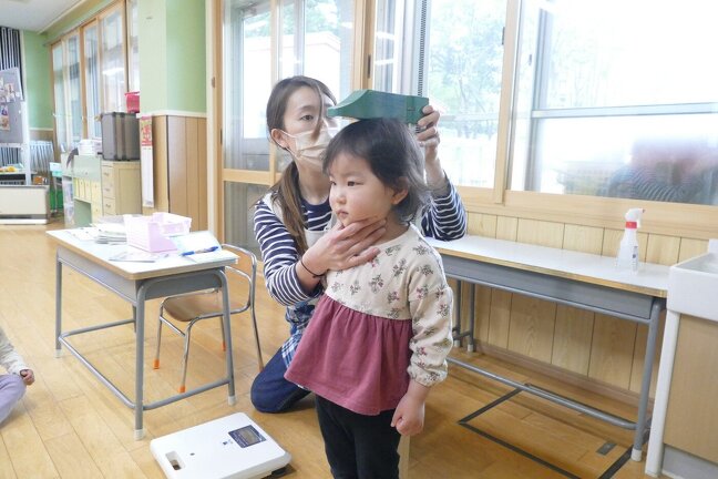 今日は今年度初めての身体測定をしました。はじめての子供達もドキドキしながら測定していました。在園児たちは「どのくらいおおきくなったかねー」と言いながら、測定していました。