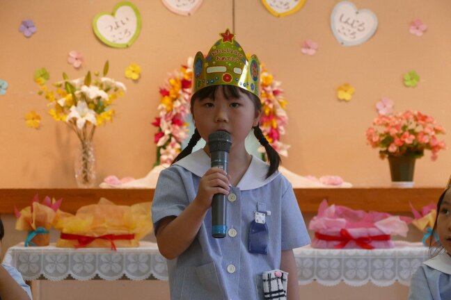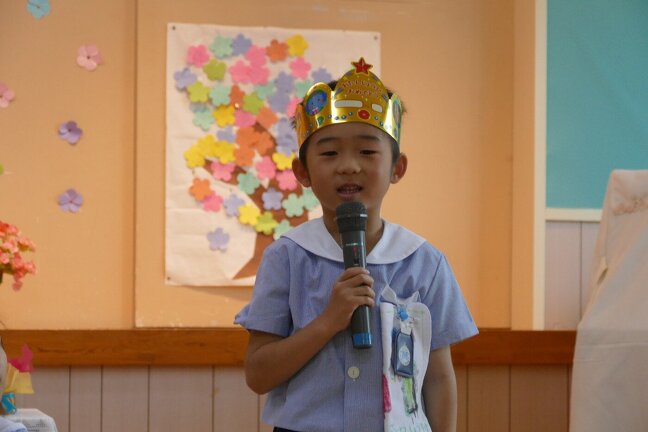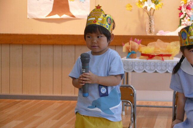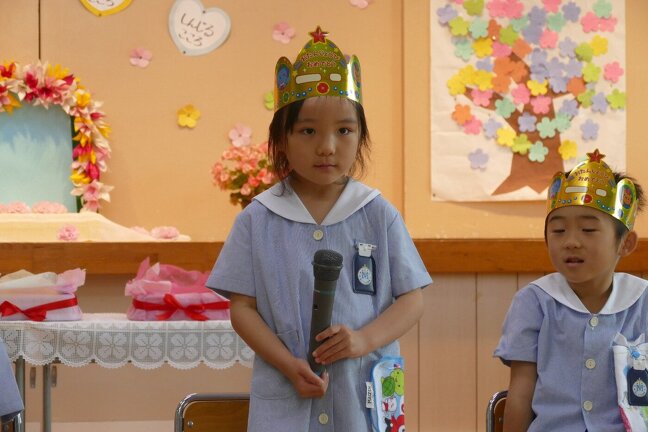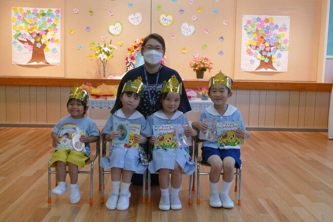 今日は5月のお誕生会でした。お休みのお友達が2人いて残念でしたが、4人のお友達がお誕生日をお祝いしてもらいました。いちご組さんと年中・年長のお友達でした。