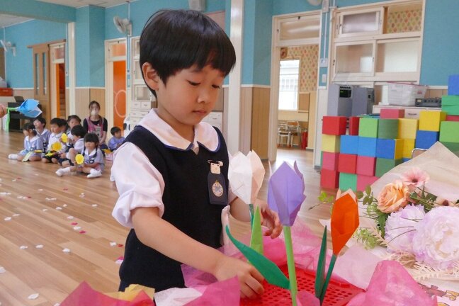 今日はお誕生会の後に、マリア祭がありました。今年は年長の女の子が白い衣装で登場!特別のお仕事をしました。