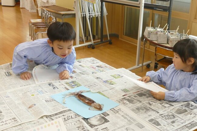 題材は「するめいか」。触って吸盤の感触を楽しんだり、匂いを嗅いだりと初めて触る子ども達ががほとんどでした。割りばしに墨汁を付けて描く事には、とても慎重に真剣に取り組んでいました。