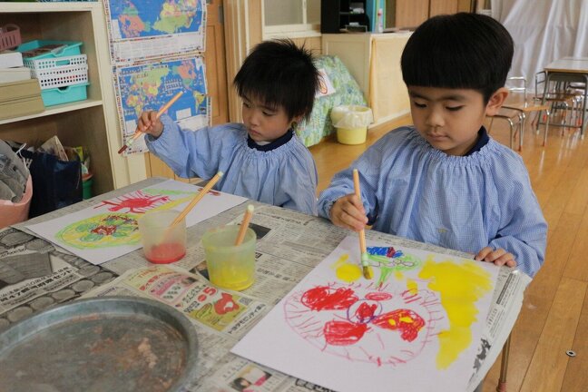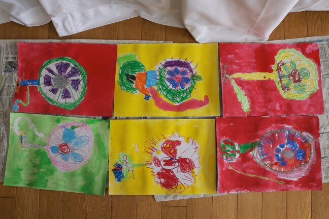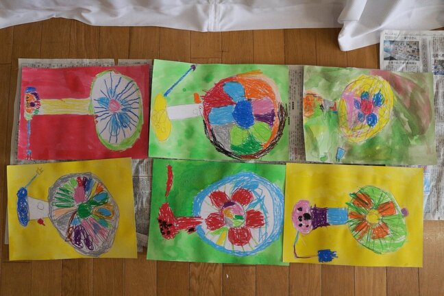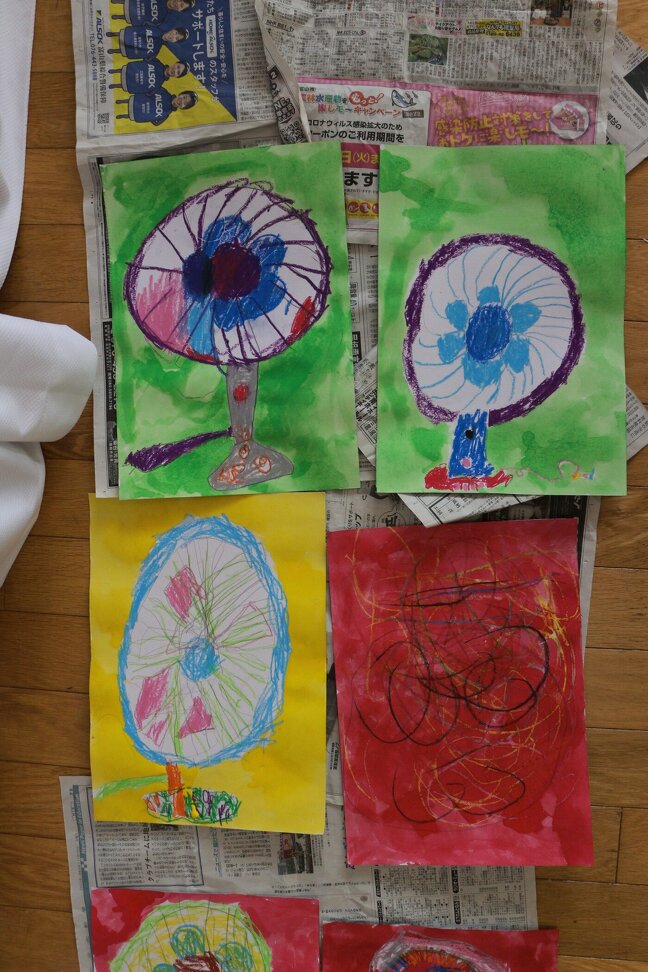 今回の絵画制作は、「せんぷうき」。少しレトロな扇風機を自分の好きな色でえがいてみました。とっても個性的な扇風機が沢山出来ました。
