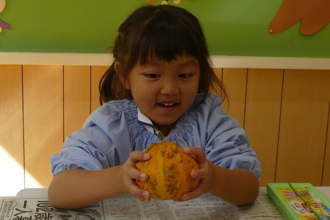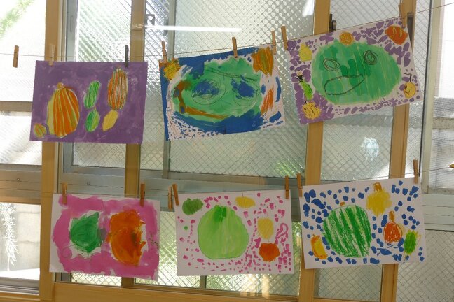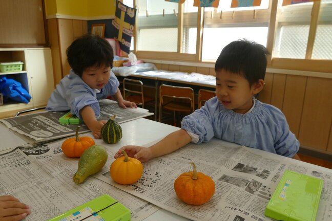 いろいろな形や色のかぼちゃを見て、触って、楽しみながら描きました。