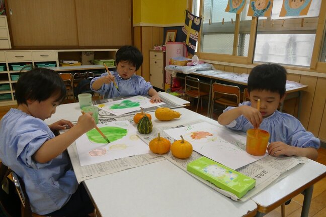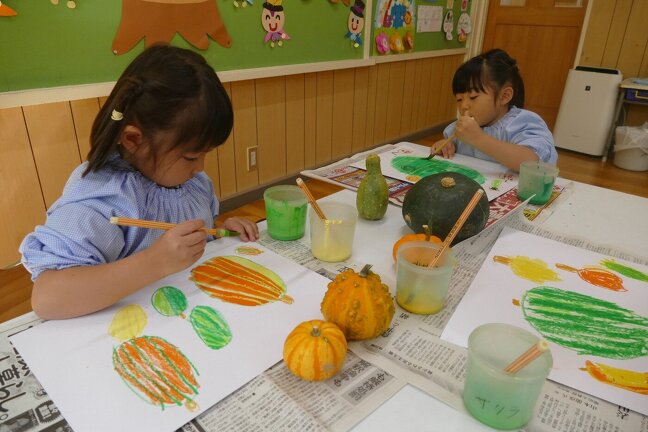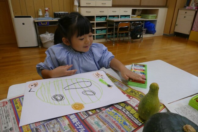 今日は年少組さんの絵画教室でした。今回はハロウィンも近いので、かぼちゃを描きました。