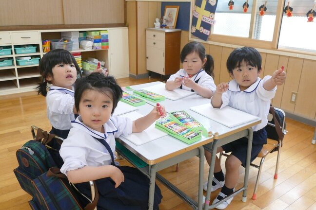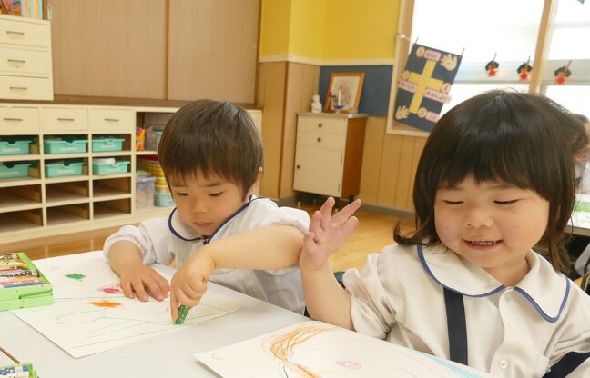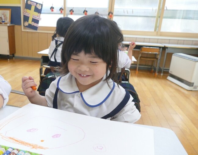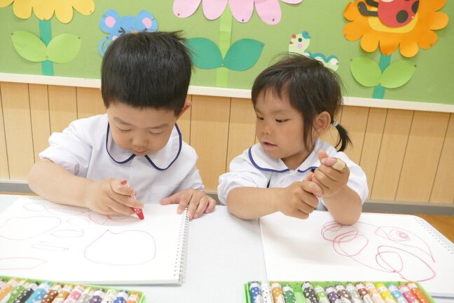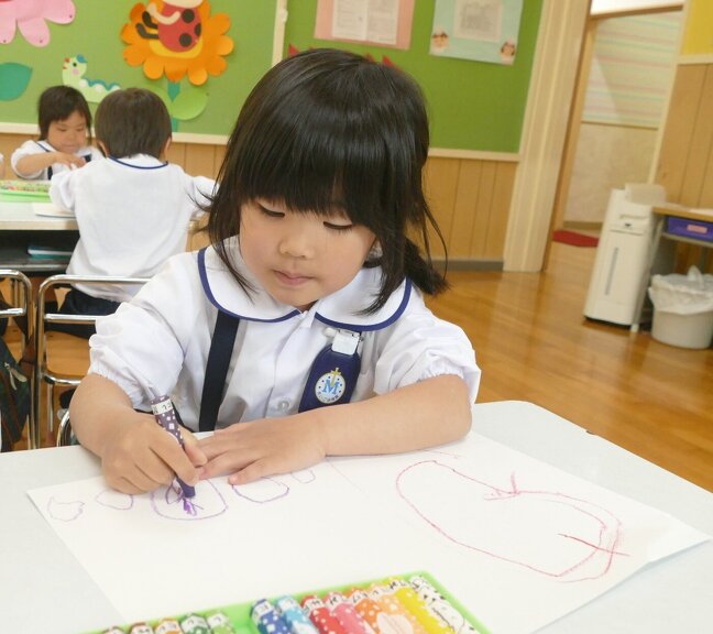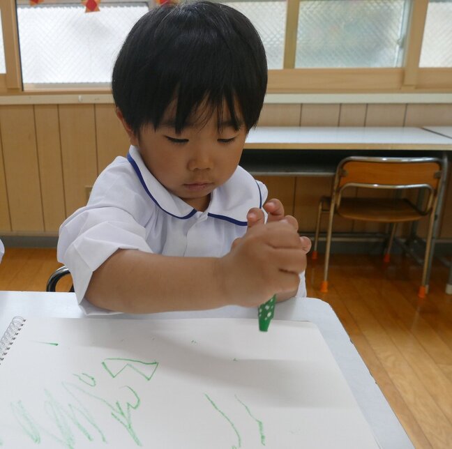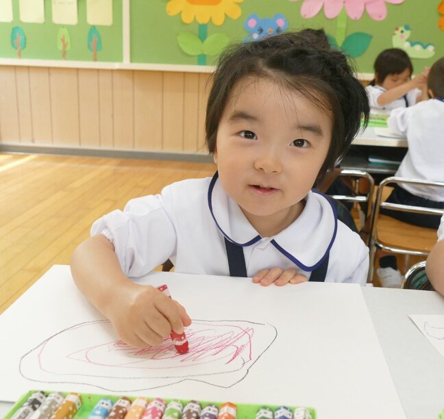 クレヨンの色あてゲームをした後、好きなフルーツや、 好きな物を描いてみました。 上手にに描けたかな