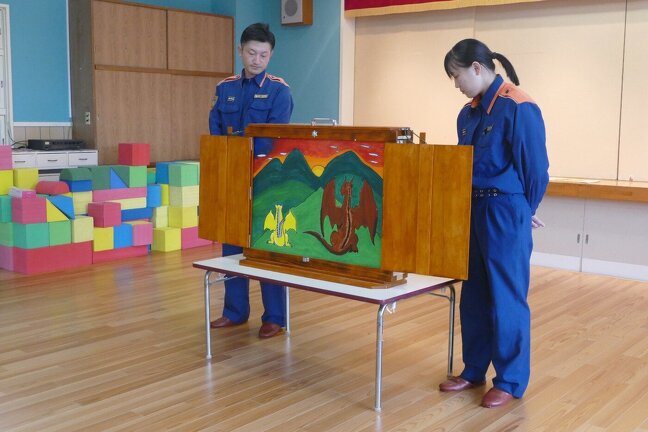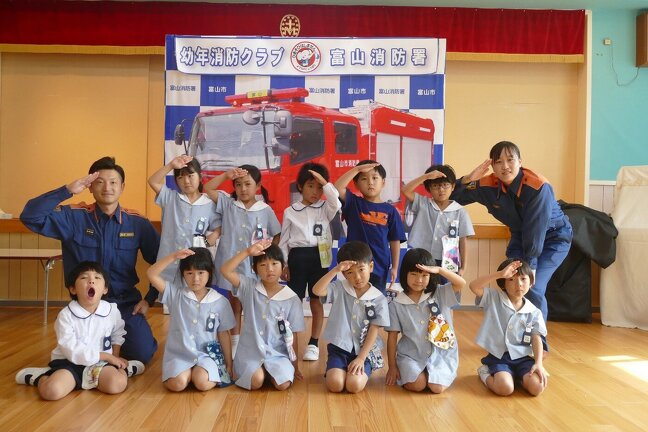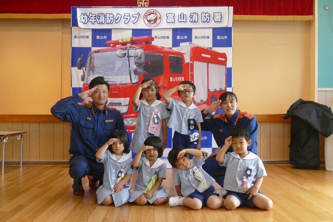 今日は防火教室でした。大きな紙芝居をみせてもらい、 お話を聞いてお約束もしました。 最後は消防車と記念撮影!!