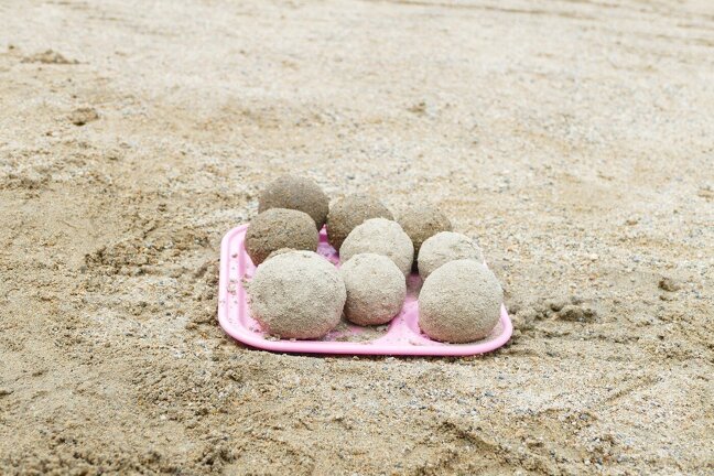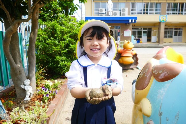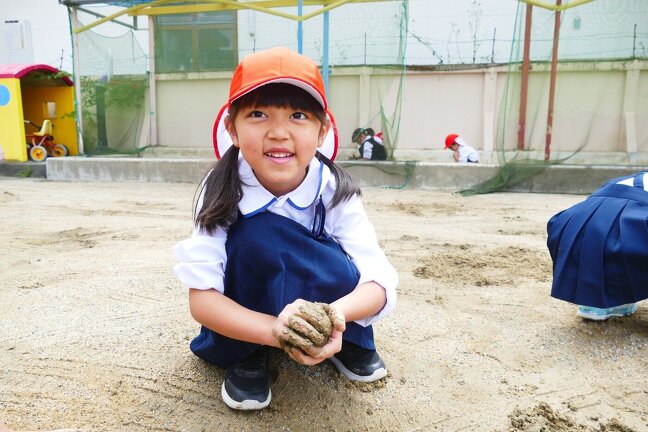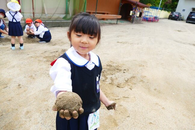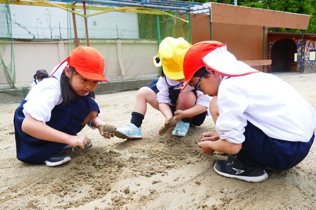 どろ団子づくりに挑戦中!泥でお団子を作って、乾いた砂をふりかけてにぎって、さらにふりかけてを繰り返し、試行錯誤しながら作っています。泥の感触もきもちいいね!