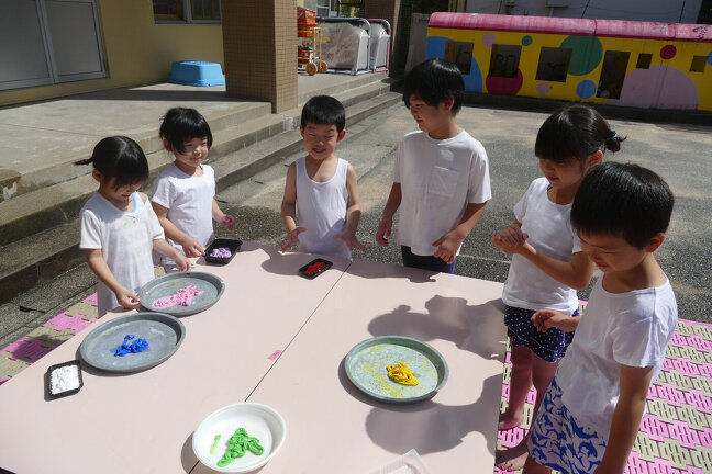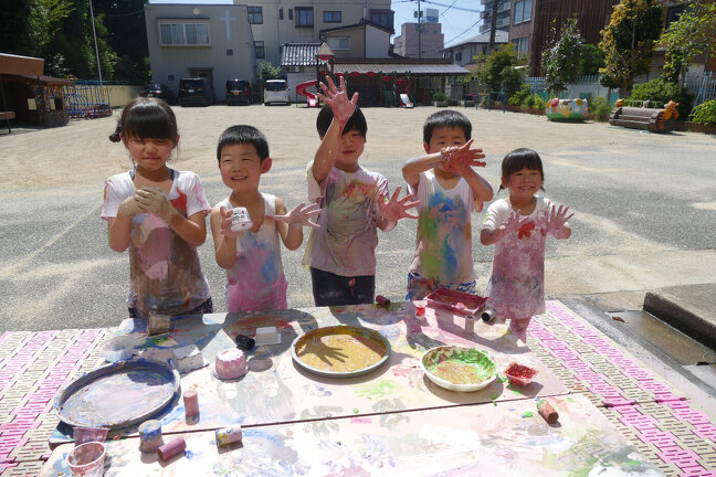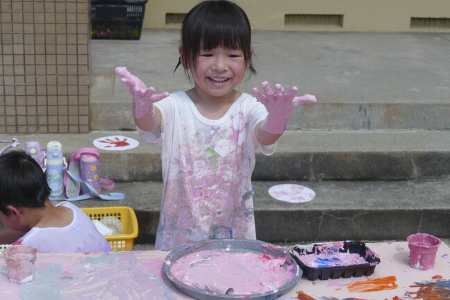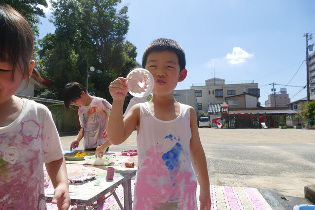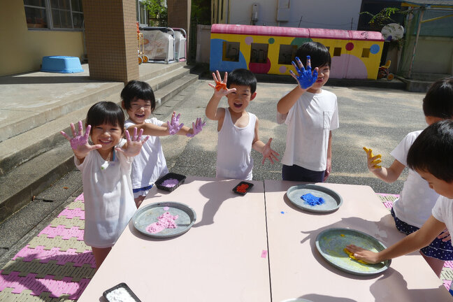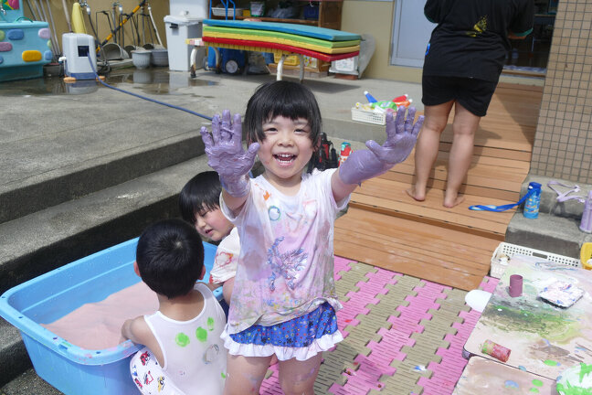 まだまだ暑い日が続きます。水遊びを継続中ですが、今日ボディーペインティングに挑戦しました。日頃とは違う体験で最初は慎重に触っていましたが、だんだんエスカレート!