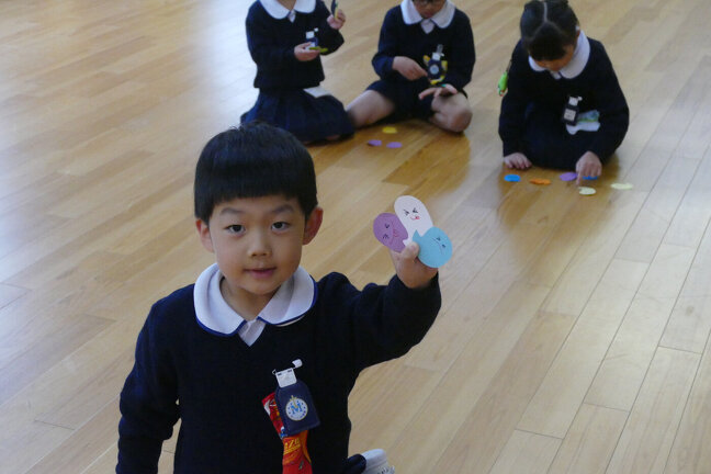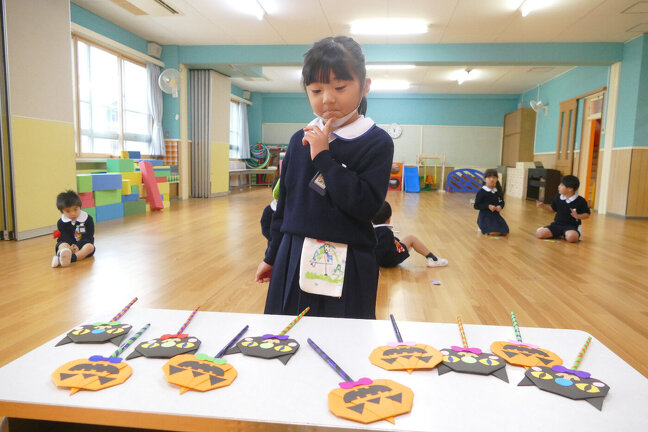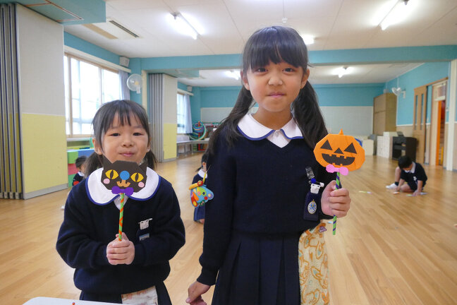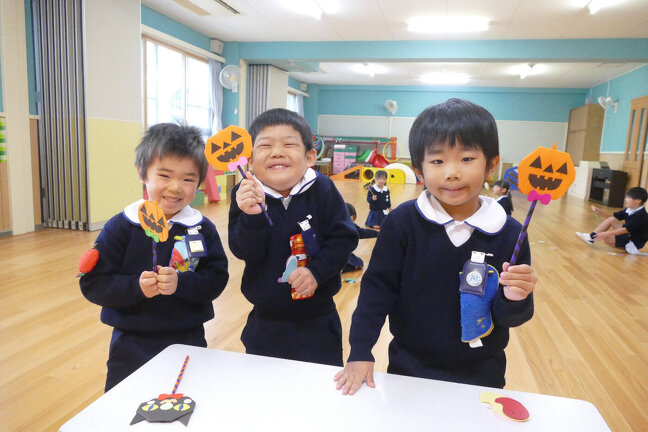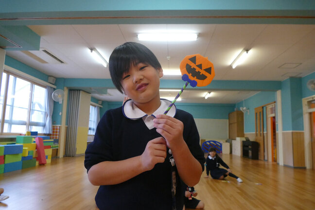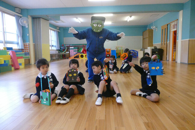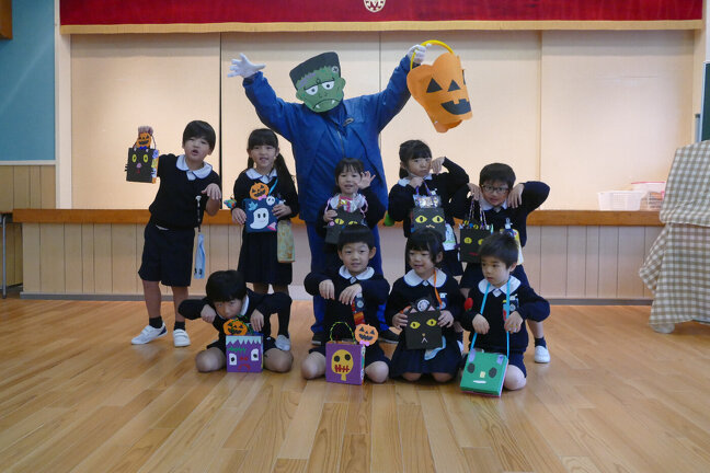誕生会の後にハロウィンをしました。お話を聞いて、お化け探しゲームをしたり、ハロウィンダンスをしました。その後フランケンシュタインがやってきて子ども達にお菓子を配ってくれました。「トリックオアトリートー!」かわいいお菓子をもらいました。