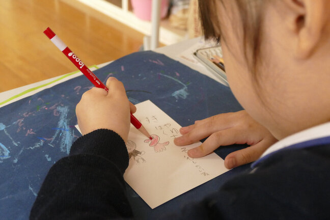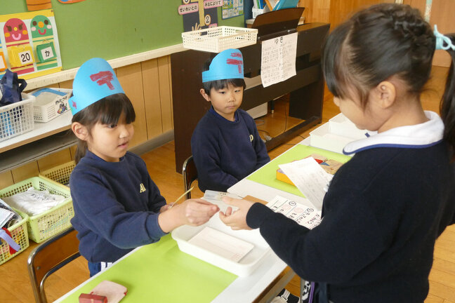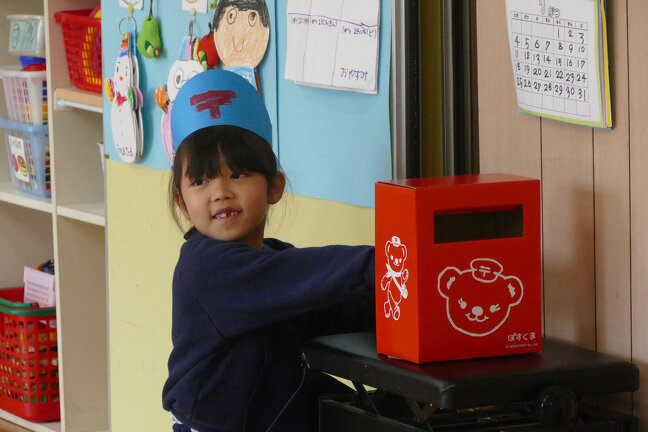 郵便屋さんごっこが始まりました。はがきを書いたり郵便屋さんになったり、お仕事をしたりと、グループに分かれてがんばりました。